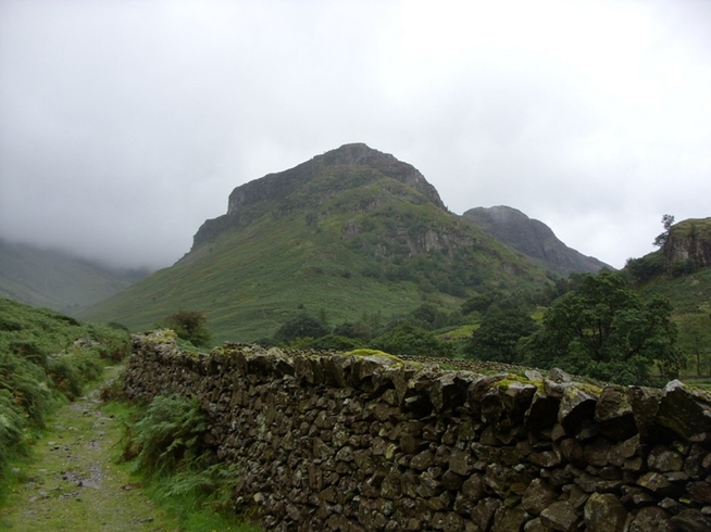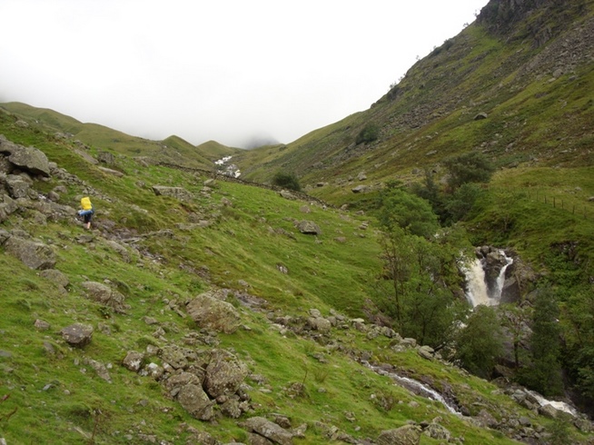 We returned to our room to grab our packs, then left the hostel, collecting our packed lunches from Reception as we left. We set off at about 8.30, walking back down the lane toward Stonethwaite, then turning left through a gate to start making our way up the side of the valley mindful of the ever present mist and light drizzle that seemed to just hang in the air. We passed a campsite on our right and were thankful that we’d avoided sleeping under canvas during the night as the place looked particularly wet and miserable. We followed the path as it led us higher and higher and became more and more rocky. The volume of rain that had fallen in recent days meant that we were constantly negotiating streams that flowed across the path, higher than they would be during periods of drier weather. Some of them were very tricky and we found ourselves hopping from one stone to another over raging water, worried that one awkward step onto a slippery rock could mean injury or at the very least a darn good soaking.