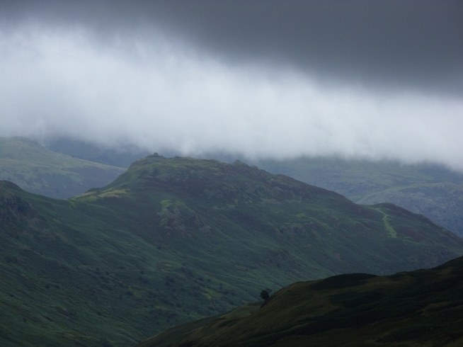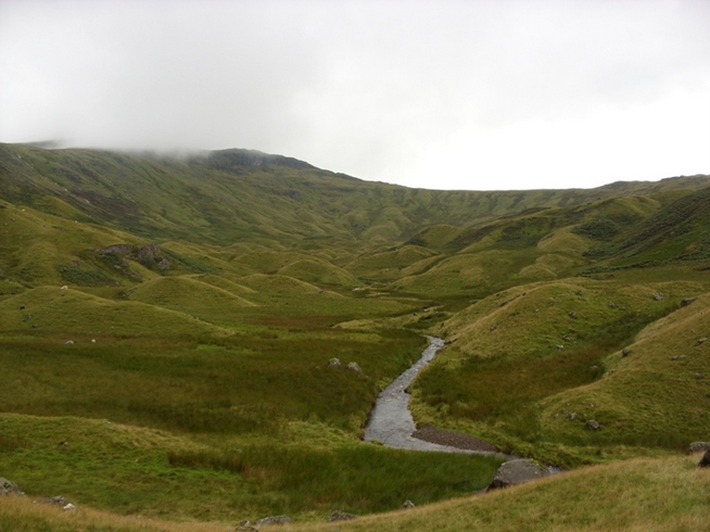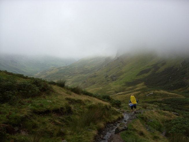 We couldn’t find any hobbits so I disappeared into the mist to find a toilet... which obviously wasn’t there. While I was gone the lone walker caught us up and was chatting with Darryl when I returned from my excursion into the fog. He was doing the Coast to Coast on his own and was using a Sherpa service to have his rucksack moved on to each campsite. We found this a bit odd since he seemed a fit bloke and should have been able to carry everything he needed like we were doing. I suppose some people can’t fight the temptation to make it easy on themselves. There is definitely logic there somewhere. The walker headed off and we followed soon after, but the fog was now really thick and we had only metres of visibility in each direction. The trail disappeared and though there were several thin trails thereabouts, there was nothing solid and definitive enough to give us any confidence. We spent the next thirty minutes wandering around in pea soup hearing the occasional cry in the distance that suggested we weren’t the only ones that had no idea where we were or where we were going. Luckily I spotted what looked like a path on an opposite hillside, so we headed for that. After following the track over more boggy ground for a while we found our way to the junction of the high and low level routes, the high one leading ultimately to Helm Crag, while the low one passes through Far Easedale, down toward Grasmere alongside streams and pools. Because of the poor weather and the day’s tight schedule, we had no choice but to take the low route.