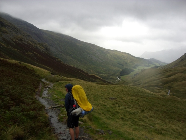 Occasionally we stopped for a breather and turned to look down across the valley toward Borrowdale and Rosthwaite. We could see a lone walker making his way up the path behind us a fair distance away, but apart from him we seemed to be alone. We continued on toward Greenup Gill, and before we knew it we were faced with a steep climb up what appeared to be a rather attractive water feature. The almost vertical rocky trail up the side of the crag was practically submerged beneath the overflowing stream and in some places it was almost like climbing a ladder. Oh the exaggeration! I should be ashamed of myself. Nevertheless it was a challenging climb with the wardrobes strapped to our backs, but soon we standing on top of Lining Crag, admiring the band of fog that circled it, partly obscuring the pretty, rounded hills below. Darryl had heard a girl at the hostel describing this day’s walk as the Lord of the Rings section. The little, green hillocks we could see certainly looked like great places for Hobbits to set up home.