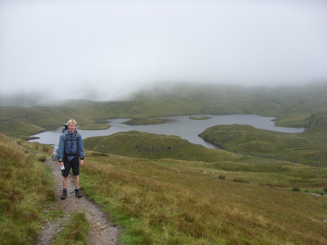 We were soon building up a good pace despite the uneven, muddy ground and though the mist descended along with a light rain, we just put our hoods up and plodded on with business as usual. We soon came to Angle Tarn, lying still under the clouds of mist, the odd bored-looking sheep dotted here and there, no doubt tired from trying to get in our way on the path. If the weather was good, Angle Tarn would no doubt be a pretty decent place to camp.