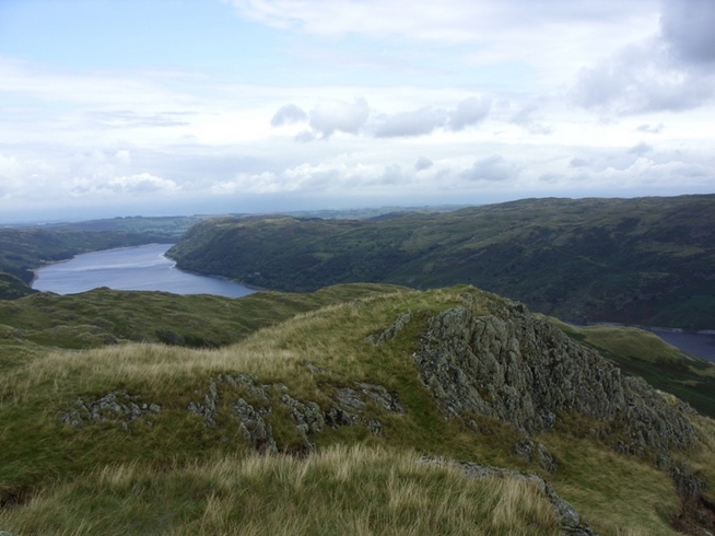The steep descent to Haweswater begins with a scramble over rocks, then it’s a long, steep, grassy slope dotted with ankle-twisting potholes and ruts. Many people have come a cropper on this section and wearing heavy packs doesn’t help. We tried to take it slow but because of the gradient it was difficult not to pick up speed. Nevertheless we both made it down in one piece, and once we’d crossed the bridge we were at last walking alongside Haweswater Reservoir.
