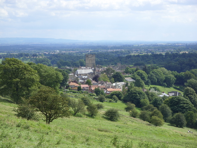 Managing to avoid harsh words we headed back down to and across Clapgate Beck, then up the side of the bank and along the high path leading to West Applegarth Farm. The path along the ridge offered great views of the valley below including a caravan park nestling among the trees. We passed by a few farm buildings, then wandered up and down the hill a bit across a small section of scrubland until we came to Whitcliffe Wood. I was looking forward to this section since it was the only proper forest section of the whole trip, and Wainwright himself had described it as ‘lovely.’ I was disappointed though. It amounted to little more than a dark, sloping path up the hill that lasted about ten or fifteen minutes, with nothing to really inspire the imagination. It was quiet and pretty, but that was about it. We soon emerged back onto the hillside path from where we would soon get our first glimpse of Richmond. Only twenty minutes later we were walking into Richmond town centre.