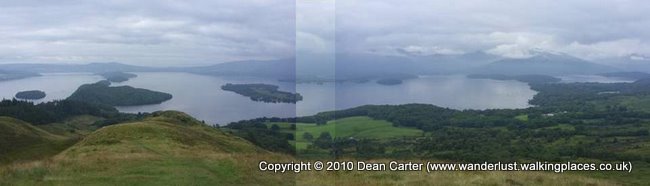 The first part of the ascent of Conic Hill itself was very steep and hard on the feet and even though the gradient eased a little, it was still tough and dragged on longer than we’d have liked. The way bypasses the summit, so we broke off from the path and followed a very steep track to the summit where we had a break and were rewarded with impressive, if misty views of Loch Lomond and the Highland fault line.