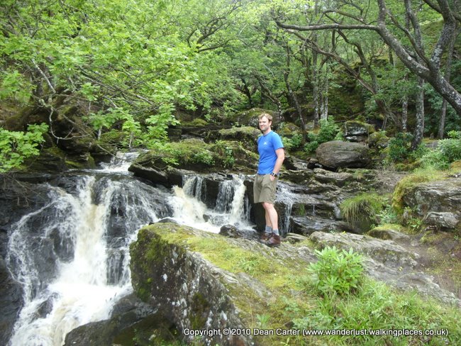 We passed a few tents as we walked, proving that other people had gone beyond the wild campsite and found their own nice little spots. We also caught up with a couple of other walkers and proceeded to reel them in before having to divert down a side path for a toilet break. We followed a long, high wooded section above the Loch that seemed to get higher and higher as we went. There wasn’t an awful lot of level ground, and it got worse as we descended back toward the Loch and eventually to the falls at Inversnaid and the Inversnaid Hotel where we stopped in the bar to have a couple of coffees each and some scones.