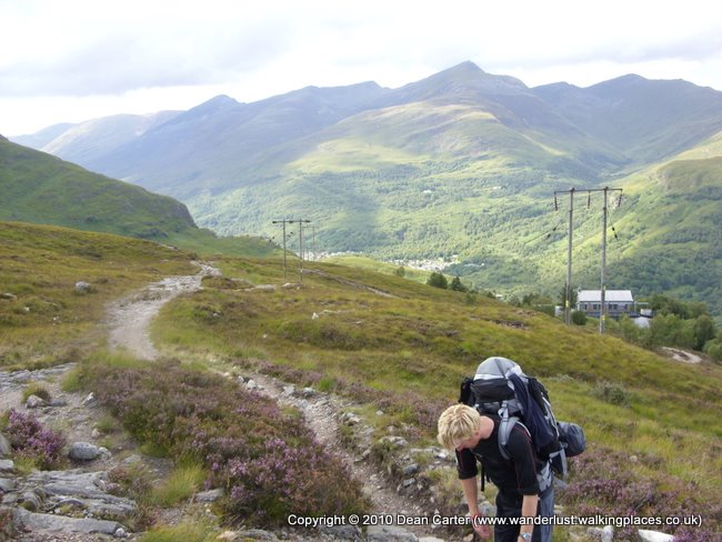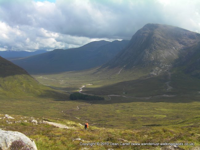 Eventually we had to leave the Kingshouse Hotel and carry on along the path. There were a couple of tents behind the Kingshouse Hotel and I couldn’t help but wince after reading that this was one of the worst places in Scotland for midges. Apparently they could swarm in thick, black clouds. It was hard not to shiver at the thought. Thank God we never wild-camped at Kingshouse as we had originally planned. We saw some deer as we walked and I took several more pictures of Buachaille Etive Mor as we headed toward the Devil’s Staircase, the steep hill path that twisted up from the valley floor to the high mountain road that would lead us to Kinlochleven. About a mile from Kingshouse two foreign guys stopped us and asked how far it was to the hotel. It seemed a lot of people around there were keen to get to Kingshouse. God knows how walkers would manage if that place ever closed down.