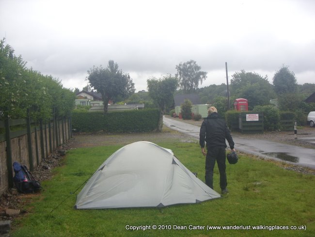 We slogged through the rain and fairly uneventful scenery until we eventually reached the turn off to Gairlochy. We then had to walk about a mile along a country road and up a hill to get to the caravan site which (understandable given that it was a wet Monday) was practically deserted. There was only one other tent on the small section of grass near the entrance, and one or two people in motor-homes, but apart from that the place was dead.
