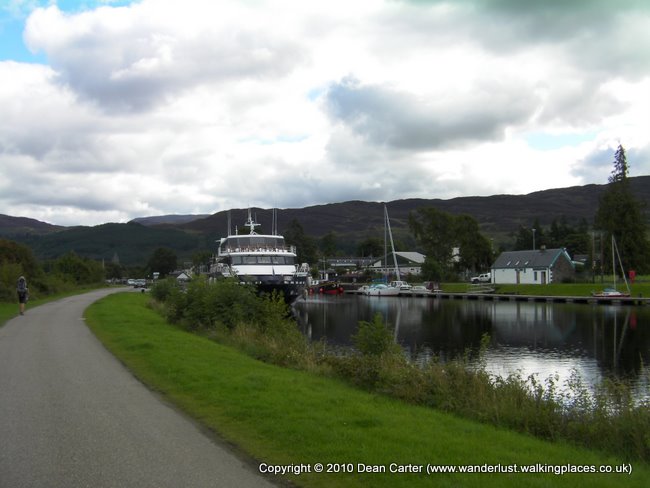 When we got to the end of the railway line and the far shore, we stopped for a break by the water’s edge and were soon passed by the two American guys we hadn’t seen for about a week. Moving on we now walked along the Caledonian Canal again for several miles, passing and chatting to the American guys and seeing a few boats on the water. The Sun was out now, and the warm weather was a drastic improvement on previous days. It was canal all the way to Fort Augustus where we were almost spoiled for choice when it came to places to buy refreshments and provisions.