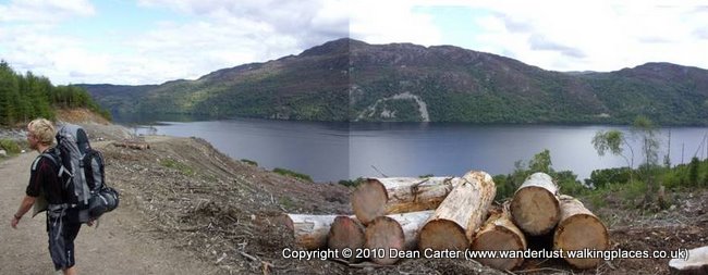 Fort Augustus was clearly a tourist town (probably due to it being on the southern shore of Loch Ness) and there were a lot of people milling about the canal and shops. We first found a quiet pub on a side road and ordered a couple of coffees, before leaving to get some chips from a shop by the canal, and crossing the water to buy food and drink from the small supermarket. We then left the town to climb up a road leading into a wood where we found a quiet spot to eat our chips and some strawberries I’d bought, quiet that is until we started getting attacked by a couple of bored wasps. We then followed another forestry track alongside Loch Ness.