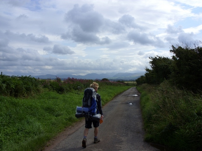 We turned right at the nearby cottage to head down a long lane toward Sandwith. We now had our first views of the Lakeland fells and they looked awesome. Neither of us had been to the Lake District before so we were looking forward to it. The fells loomed high in the distance, shrouded by cloud, and the path we were on seemed to be aimed directly at them.