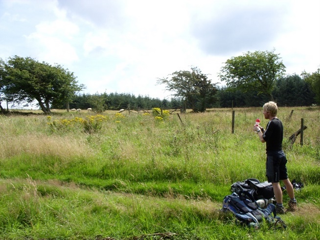 We turned off the route and followed the path toward the farm after saying goodbye to Denise and Stuart who had booked themselves into bed and breakfasts along the whole route (lucky buggers). The woman at the farm welcomed us and showed us to a small grassy area where we could camp. It was actually a really nice place to pitch our tents. We had the area all to ourselves, and though it was windy there were trees and bushes to keep most of the wind away. We also had use of a small TV room (actually a shed full of junk with armchairs and TV) and the toilet and shower at the back of the farmhouse that was also used by the bed and breakfast guests. The farm had several dogs too. By my count there were two Border Collies, two Rottweilers and a cross-breed. Anyone crazy enough to drive all the way to Low Cock How to burgle the place would be mauled to pieces in seconds. We pitched our tents and the rain returned as we made a dinner of noodles and tinned mackerel followed by chocolate digestive biscuits. We showered then sat in the TV shed for an hour or so watching a Porridge film. It was actually a very relaxing evening and just what we needed after a surprisingly tiring first day. It was still raining a fair bit when we left the shed to head back to our tents for the night. We crawled into our bags aching and tired to read for a while before sleep.