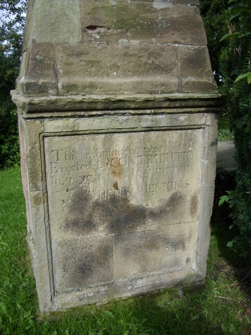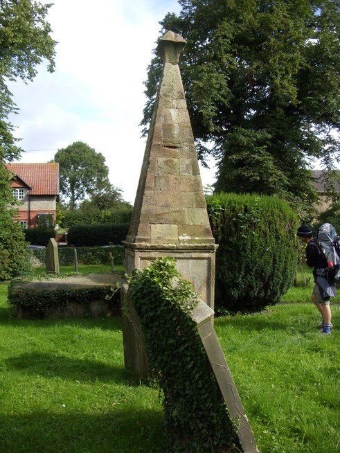 Not long after passing the woman with the dogs we stopped in a field to have a break and eat some biscuits (McVities white chocolate chip and raspberry cookies (delicious)) and a good drink. We then pressed on across some rather muddy fields to the village of Bolton-on-swale which I knew about from watching Wainwright’s Coast to Coast DVD. In the churchyard is a large monument to Henry Jenkins, a local man who was supposed to have lived to the rather overripe old age of 169 years.