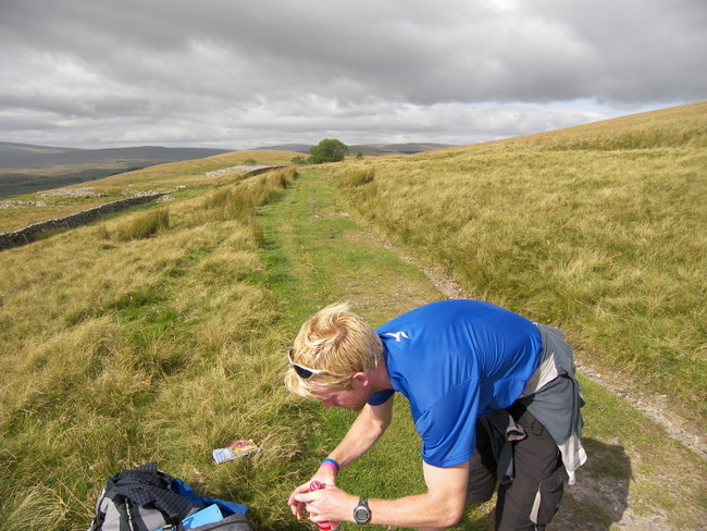 I took my shoes and socks off while we rested and was very tempted to dip my feet in the stream, but thought of the difficulty and anguish involved in taking them out again. The afternoon was progressing now and we still had several miles to cover before we could call it a day. As we rested and guzzled down water in the heat of the sunny afternoon, we discussed our accommodation for the night. In our guidebook there appeared to be a campsite a mile or so out of Hawes, which meant a further mile added on to our journey, or we could stay at the youth hostel in the town, which would cost a few pounds more but would be a more comfortable way to spend the night. It’s amazing how relatively small things can excite you under certain circumstances, but if you’ve been walking miles and miles for days, and camping each night, it isn’t long before a youth hostel seems like a five star hotel. A proper bed, a kitchen to use and cooked meals if you want them, a shop, alcohol… It all sounded like such a terrific idea. Darryl didn’t have a great signal on his phone at that point and though he tried calling a couple of times, he couldn’t get through, so we decided to walk on for a mile or so and try and phone down to Hawes when we took our next break.