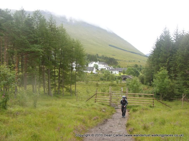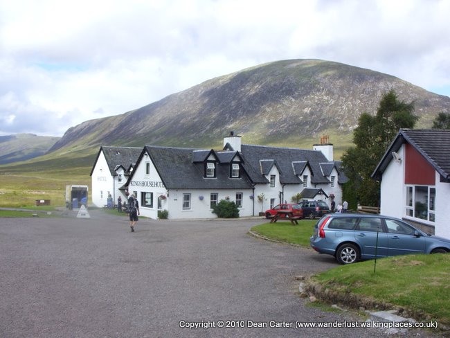 We pushed on along a rather steep section of path before descending toward Glen Etive and Glencoe. We had our first view of the mighty Buachaille Etive Mor and it looked awesome standing at the head of both glens and dividing them. We could see a tiny white building far below us and on the other side of the valley which had to be The Kingshouse Hotel. We were very keen to get there and have a break for something to eat and drink. After another mile or so of walking we finally reached it and I sat down outside with the bags while Darryl went in to buy a couple of drinks. It was a great place to stop for a while. The view was stunning and the only real disturbance was the light traffic on the road that headed into Glencoe. There were too many coaches and cars to count. After we’d finished our drinks we went inside the hotel and sat in the main bar where we both ordered the Kingy venison burger and chips. I had another pint of coke to make sure my energy levels were nicely topped up. We met three soldiers (one guy and two girls) who were walking the way as part of their leave. They were also carrying camping equipment but had used a couple of hostels. They didn’t hang around and were certainly a challenge to keep up with.
