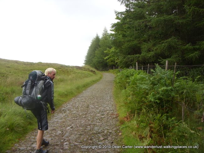 On our way down the path we passed an Australian girl taking pictures of the Loch with a pretty impressive camera. I took a couple of pictures but standing still for more than a second or two allowed the midges to land, so I made the stop brief. Walking on in more depressing drizzle we soon came to the Inveroran Hotel which didn’t seem to be open so after stopping to get our waterproofs out and batting away more infernal midges, we continued on over a bridge, noticing a tent by the side of the river. Good luck to whoever was inside - the midge presence must have been near intolerable.