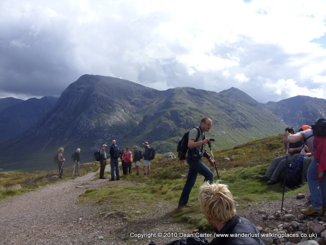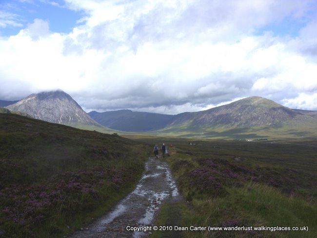 Eventually we had to leave the Kingshouse Hotel and carry on along the path. There were a couple of tents behind the Kingshouse Hotel and I couldn’t help but wince after reading that this was one of the worst places in Scotland for midges. Apparently they could swarm in thick, black clouds. It was hard not to shiver at the thought. Thank God we never wild-camped at Kingshouse as we had originally planned. We saw some deer as we walked and I took several more pictures of Buachaille Etive Mor as we headed toward the Devil’s Staircase, the steep hill path that twisted up from the valley floor to the high mountain road that would lead us to Kinlochleven. About a mile from Kingshouse two foreign guys stopped us and asked how far it was to the hotel. It seemed a lot of people around there were keen to get to Kingshouse. God knows how walkers would manage if that place ever closed down.