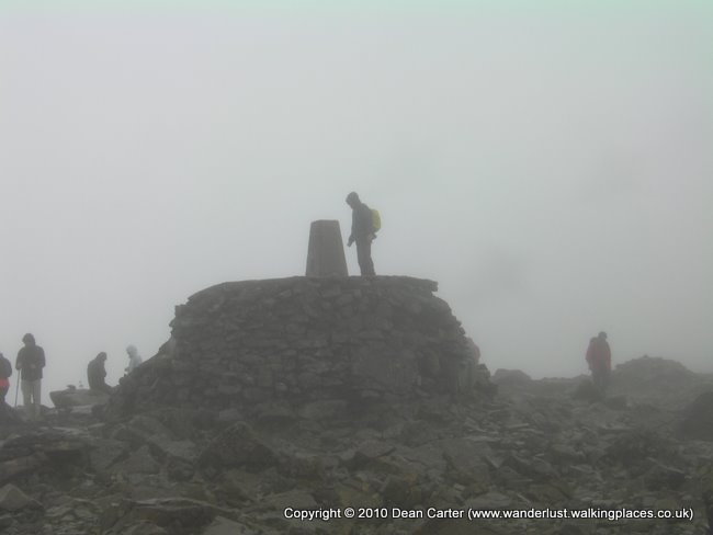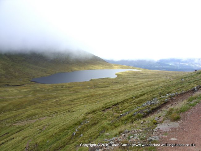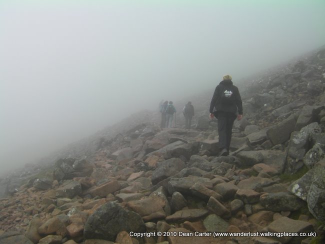 We made good time reaching the halfway lake (Lochan Meall an t-Suidhe) and proceeded to climb the second lump of the ben which would lead us to the summit. The beginning of this second section climbed in long zig-zagging stretches, the path still consisting of rocks which eventually gave way to smaller scree and less sure footing. The mist soon swallowed us up and we could see little more than the ground and the occasional indistinct figure above or below us.