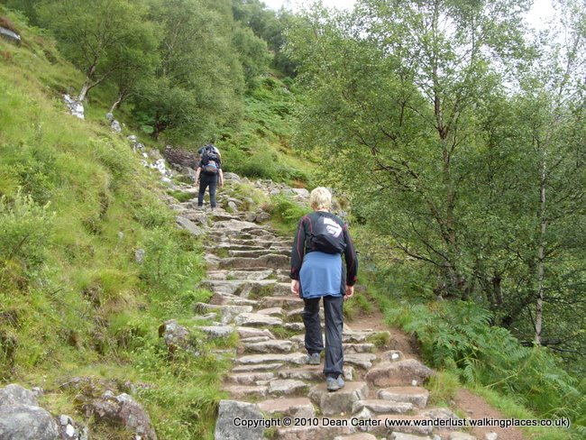 I woke at around 6.45 and was up and about by 7.30. The sky was grey and there were a lot of clouds hovering around the higher reaches of Ben Nevis. Despite a decidedly grim weather outlook, we left the camp at about 9.30 hoping the weather would improve, and turned right at the main road to walk down to the youth hostel, opposite which was the steep path that climbed up to join the main tourist path up the ben.