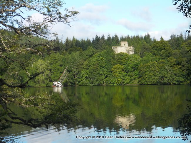 We walked back up the road to rejoin the way and soon came to a disused and overgrown railway line. The old train platform was hard to spot as it was almost completely reclaimed by the undergrowth. We walked alongside Loch Oich, seeing a half-sunk boat on the other side, just below the remains of Glengarry Castle.