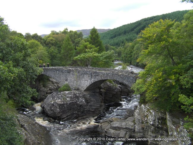 It wasn’t far to Invermoriston and as we dropped down to near loch level we saw holiday chalets and B & Bs, but no campsites or hostels. Darryl asked a girl out walking her dog about campsites and bus stops, but she said she hadn’t been in the area long so couldn’t help (why are these people the only ones around when you have to ask directions?) The mention of bus stops however got me thinking, and I suggested that maybe we could get a bus from Invermoriston to Drumnadrochit and camp there two nights in a row. We could camp there for the night, then get a bus back to Invermoriston to do the stretch from there back to Drumnadrochit. It would mean not having to pack up our tents for a day, and we would also be carrying less the second day. We walked across the bridge into the town with a fantastic view of another bridge nearby and found the bus stop to check the times.