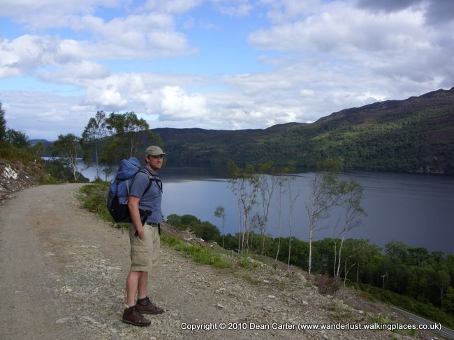 We soon caught sight of a couple walking ahead of us and moving fairly slowly. When we drew level with them they recognised us and it turned out they were the sole other campers at Gairlochy (Camp H20). We chatted for a while and found out they were from Israel and were relieved the weather had improved. They had looked as miserable as us at Gairlochy, and who could blame them? We left them behind and continued up the mountain track, at one point seeing a campsite symbol sprayed onto a tree in neon orange paint. We followed the painted arrows that disappeared into the gloom of the forest and eventually came to the bottom of a slope. Darryl had gotten ahead as I was filming, and when he came back along the path he said he had seen what had looked like a campsite but it looked distinctly ‘Hills Have Eyes,’ so we retraced our steps back to the path and continued on, hoping that the camping and caravanning site marked on our map would have space for us, since it was right next to Loch Ness and could be busy. We turned off the path to head down to the busy road, then crossed and walked to the site which didn’t actually provide camping. This was disconcerting, and we were about to move on when we decided to ask the cost of staying in one of their ‘hobbits’ which are long, cylindrical structures like hobbit holes that fulfil the same function as the wooden wig-wams we’d seen earlier in the trip. They looked good and we would certainly have appreciated staying in one, but it would have set us back about £17.50 each so we decided to give it a miss and maybe wild camp further along the track if necessary, or camp at Alltsigh. So we walked back along the road and back up the rough trail to rejoin the footpath.